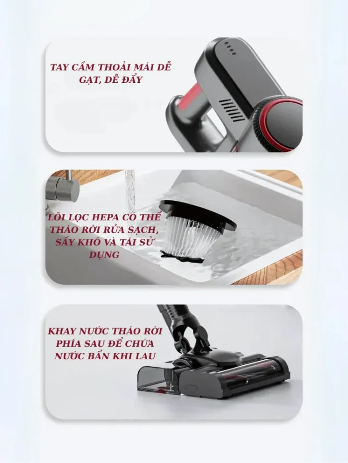 Chắc năng: Hút bụi sàn nhà, lau nhà, giường nệm, ô tô, sàn nhà, lông chó mèo, tóc…