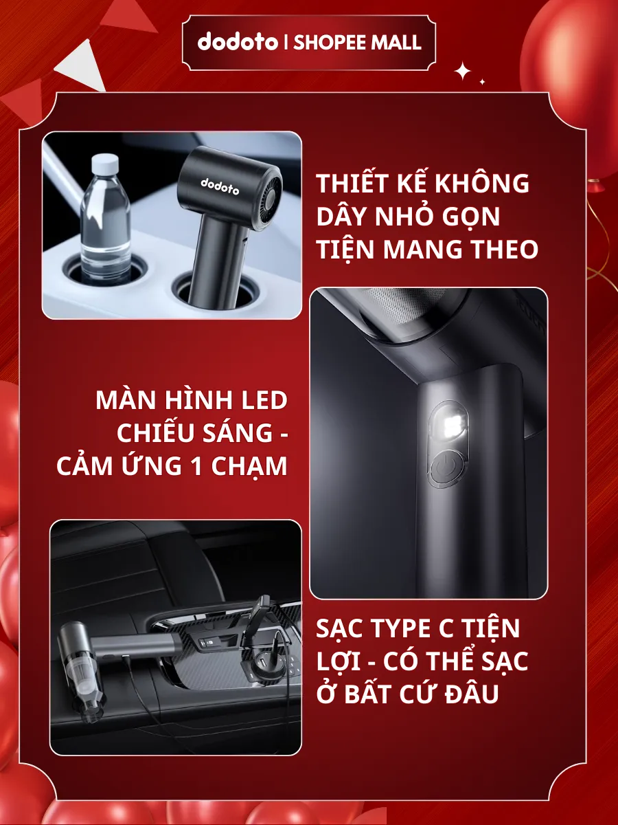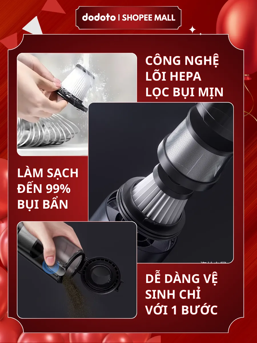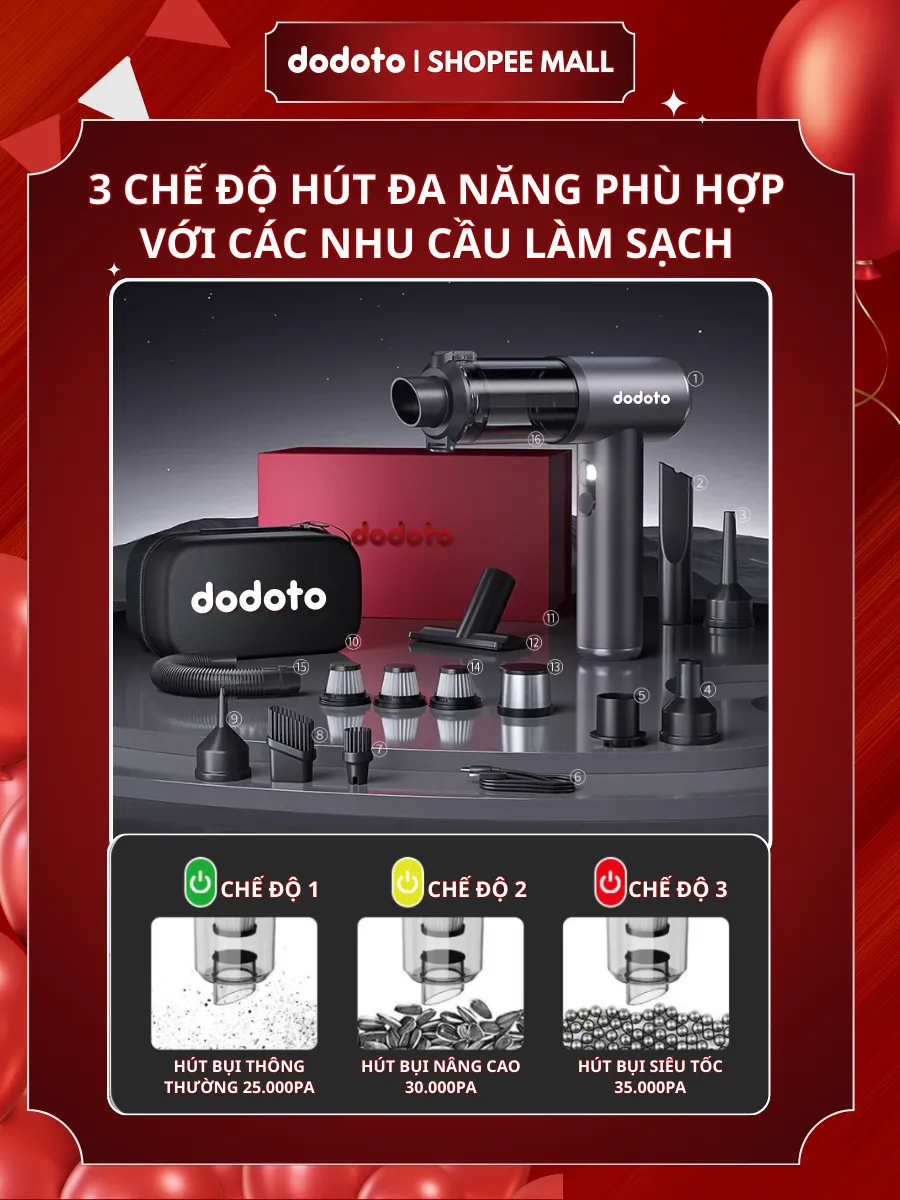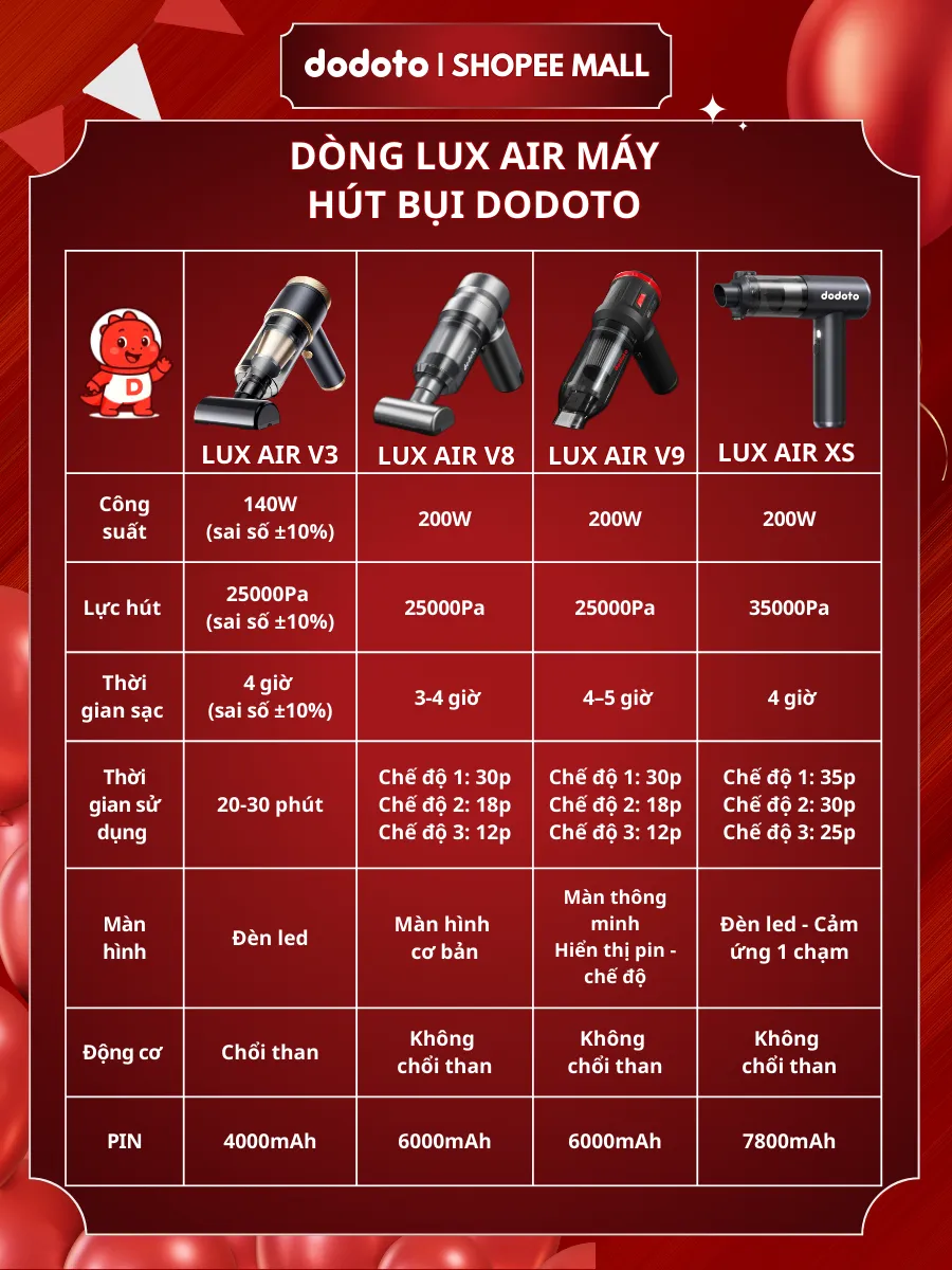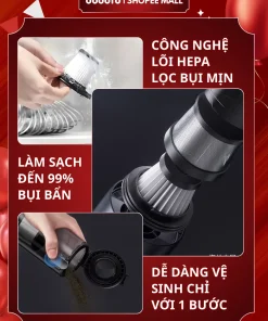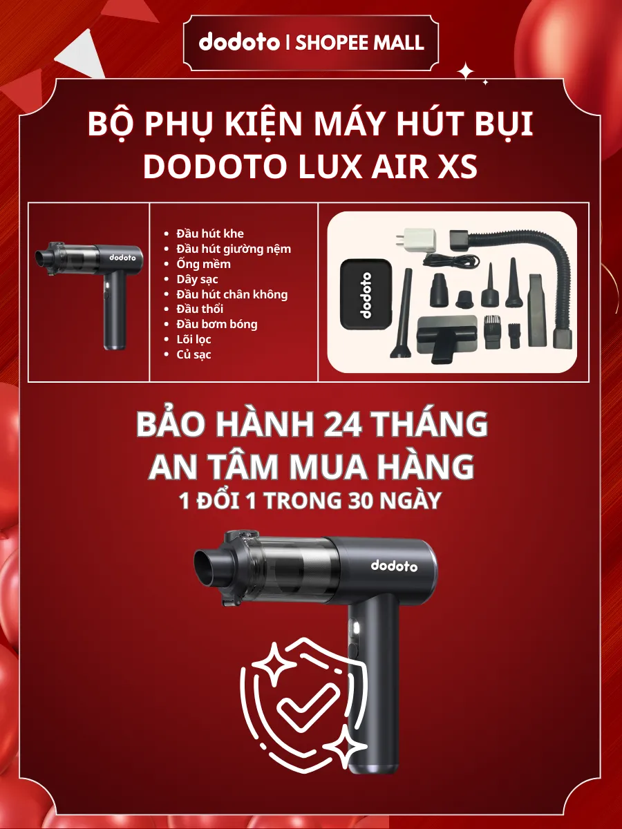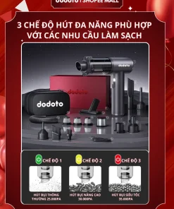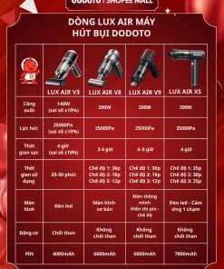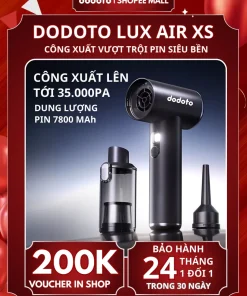 Máy hút bụi cầm tay dodoto Lux Air XS lực hút 35.000Pa, thiết kế không dây siêu nhẹ 0.4kg, kèm 4 đầu hút đa năng làm sạch giường nệm, sofa, ô tô và khe hẹp. Pin dùng 30–45 phút, lọc HEPA 3 lớp, bảo hành 24 tháng